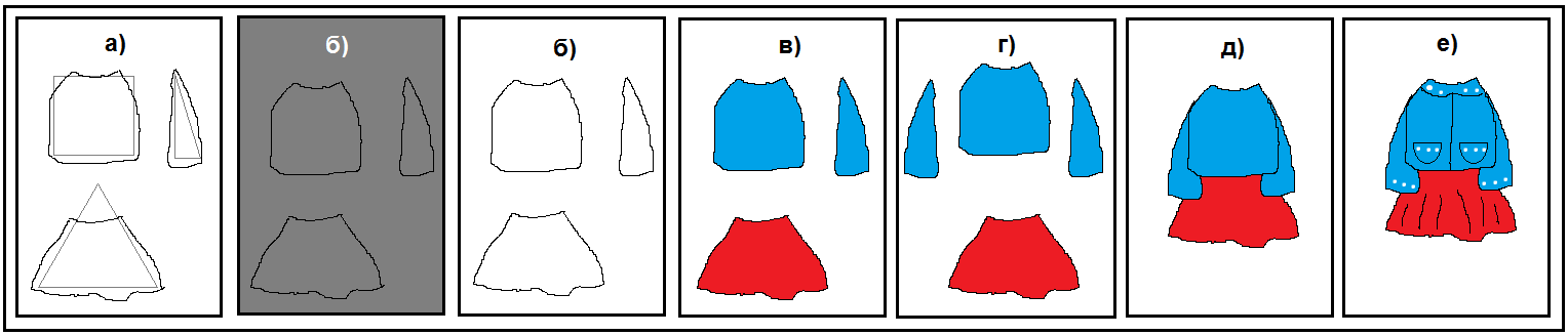 Внимание! Это только схема! Для создания рисунка человека надо (см. второй рисунок): а) некоторые детали нарисовать серым цветом, затем обвести их карандашом или кистью 1 (выбираем цвет, отличный от цвета контура); б) залить всё цветом контура, а затем белым цветом; в) раскрасить детали; г) скопировать и отразить парные детали; д) собрать фигурку, предварительно продумав порядок сборки; е) добавить украшающие элементы.