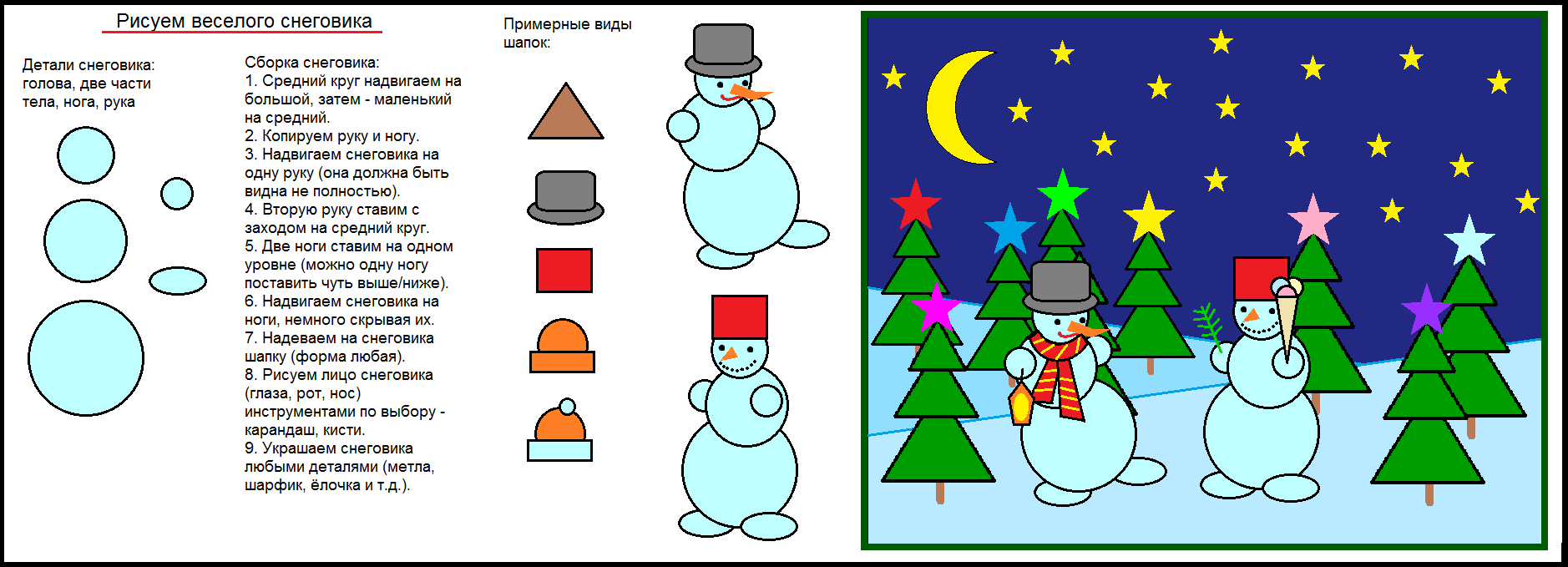Алгоритм рисования веселых снеговиков и пример новогоднего рисунка (смотреть в режиме увеличения)